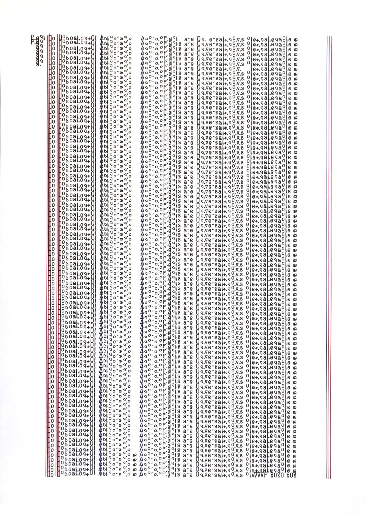 Walter van Rijn (2020) BeingAndroid_text201; ink on paper; 300x420mm (380x500mm framed); hybrid human robotic drawing. All papers acid-free and framing conservation standard with reflection free glass. For this series, I used a computer-generated font which is just about readable for us humans. The full text is cut up and spread over the five drawings. It reads: